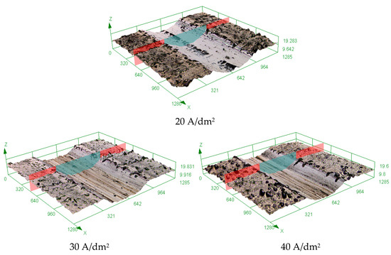 Figure 8 and Table 4 present the cross-sectional morphologies and dimensional parameters of the wear scars of the composite coating under different current densities observed using the laser confocal microscope, respectively. Under the friction provided by the GCr15 grinding ball, the surface of the composite coating underwent plastic deformation and chemical bond interactions between the atoms, leading to cracks in the coating [27]. As shown, with increasing current density, the width, height and area of the wear scars first decrease and then increase. When the current density is increased from 20 to 40 A/dm2, the degree of wear scar depression is gradually reduced, and the wear scars become shallower and thinner. When the current density is increased from 40 to 60 A/dm2, the wear scars become more depressed and wider. At a current density of 40 A/dm2, the degree of wear scar depression is low, the width reaches a minimum of 469.269 μm, and the height reaches a minimum of 8.757 μm. At this time, the wear resistance of the composite coating is the best.
