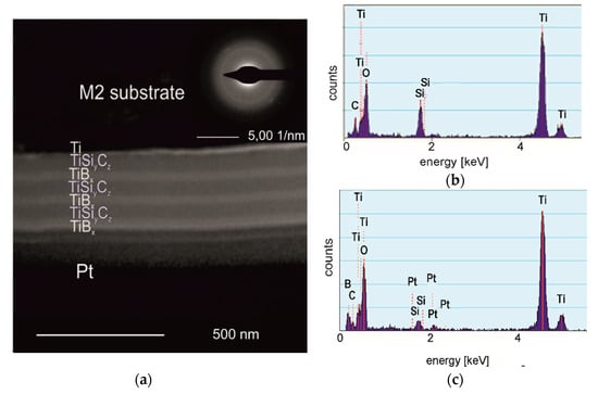 The (TiBx/TiSiyCz)x3 multilayer in as-deposited state is amorphous, as clearly indicated on Figure 1a—SAED pattern inserted in right corner of TEM BF image. Individual layers observed on the cross-section of the coating are dense, easily distinguishable. The borders separating TiBx and TiSiyCz layers are flat, continuous, free of voids and pores. The coating-substrate boundary is also clearly visible, continuous. Amorphous coatings in these systems (two- and four- layered) of similar microstructure were previously obtained by us using DB IBAD/PLD methods on monocrystalline silicon and on AISI 316L steel substrates [,]. TiBx coatings deposited by PVD methods without substrate heating are usually amorphous []. The tendency to amorphize of B-rich materials, even stoichiometric, was confirmed by []. The coating has thickness of about 400 nm, while the thickness of a single layer is about 65 nm. The thickness of coating/ single layer results directly from the time and deposition rate. For PLD method, deposition rates are relatively low, compared to other methods, and it is one of its drawbacks. However, its undoubted advantage is that coatings deposited by PLD essentially retain the stoichiometry of the target from which they are obtained. Figure 1b,c shows the EDS analysis results, taken from the TiSiyCx layer (Figure 1b) and the TiBx layer (Figure 1c). The EDS analysis clearly indicates lack of B in the TiSiyCx layer (Figure 1b) and the presence of Si, while in Figure 1c, the presence of B means that diffusion of boron into the TiSiyCz layers did not occur. The presence of Si and Pt in the EDS spectrum taken from the TiBx layer (Figure 1c) are associated with preparation of the sample for TEM observation by FIB method. The sample surface was coated with Pt layer to protect the surface and microstructure of the multilayer against modification or damage by energetic Ga+ ions. During sputtering, elements originating from the bottom of the channel formed in the sputtered area settled on the previously exposed surface of the lamella giving weak maxima in the EDS spectrum. In the case of Si, diffusion from adjacent TiSiyCz layers is theoretically possible, but insignificant due to the relatively low temperature and short time of deposition.
