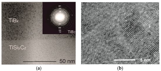 Nanostructured coatings have attracted much experimental interest in recent years mainly due to their unique physical and mechanical properties, such as high hardness, stiffness, and good toughness, that are not typically found in conventional microstructural coatings [,,,,,,,]. The superior properties of the nanostructured coatings arise from their microstructure which, controlled at the nanometric level, ensures high hardness [], high resistance to wear [,], and self-adaptation to working conditions []. Among a variety of possible nanostructured coatings, the nanocomposite microstructure consisting of at least one nanocrystalline phase embedded in an amorphous matrix has been used to obtain hardness close to that of diamond [,]. The first system tested in this area was Ti–Si–N [], but shortly after it Ti–N–B [,] and Ti–Si–B []. Titanium with boron form three compounds, namely TiB, TiB2, and Ti3B4 [], but the most extensively studied is TiB2, because of its attractive combination of physical and mechanical properties, such as relatively low density (4.32 g/cm3), high melting point (3225 °C), high hardness (25–30 GPa) and elastic modulus (450–550 GPa), good thermal and electrical conductivities, and thermal stability []. Unfortunately, due to anisotropy in the thermal expansion coefficient in the a and c axes of the hexagonal closest packed (hcp) crystal structure of TiB2, high tendency to microcrack formation during synthesis or processing of this boride is observed. Thin films and coatings of titanium diboride are relatively easy deposited by both chemical vapor deposition (CVD) and physical vapor deposition (PVD) methods, but are brittle and usually characterized by high level of internal stress. Deposition method and its parameters strongly influence on the level of internal stress built up in deposits, but also on its character []. It was demonstrated that, in the case of magneton sputtering, it is possible to obtain a low stress TiB2 coating by changing parameters of sputtering (bias) []. The hardness of TiB2 coatings can achieve 68 GPa [], for polycrystalline material, but its high hardness is associated by low toughness. To use its advantages, TiB2 is combined with softer phase capable of absorbing excess energy of cracking. Coatings based on TiB2 are designed as (i) multilayers, such as Ti-TiB2 [], TiC-TiB2 [], TiSiyCz-TiBx [], and (ii) as multiphase nanocomposite materials, containing amorphous or nanocrystalline TiB2 phase [,]. The nature of nanocomposites can be 3D-nanoparticles embedded in amorphous or nanocrystalline matrix or 2D-nanocolumns, separated by amorphous or nanocrystalline phase. One of examples of 2D nanocomposite material is the superstoichiometric (TiB2.4) coating obtained by self-organization []. Nanocolumnar grains of TiB2, separated by thin layer of boron have grown perpendicular to the substrate surface in 0.001 direction, which ensured high hardness of the coating, while boron layer effectively hindered cracking along the grain boundaries.