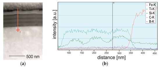 Annealing does not affect the microstructure of TiSiyCz layers, they retain amorphous. The nature of the interlayer boundaries in the coating remains sharp, as shown on Figure 2a and Figure 3a. Similar character has a border between the coating and the substrate. The EDS profiles of Ti, Si, and Fe recorded on the cross-section of coated steel after annealing (sample cut perpendicu48lar to the coating surface) are presented in Figure 3b. The content of Ti varies in the coating, and in TiBx layers it is slightly higher. The Si profile allows to determine the boundaries of the TiSiyCz layers and their thicknesses, because Si content in these layers is clearly increased with respect to adjacent TiBx layers. The position of the border between the coating and the substrate is clearly indicated by Fe profile.