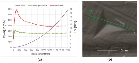 (a) Mechanical properties of the coating on M2 steel in as –deposited state, determined in nanoindentation test performed in continuous stiffness mode; (b) SEM image of the surface of the coating after indentation (in a single indentation mode, max. load. 150 mN), with marked area for thin foil preparation for TEM observations by FIB.