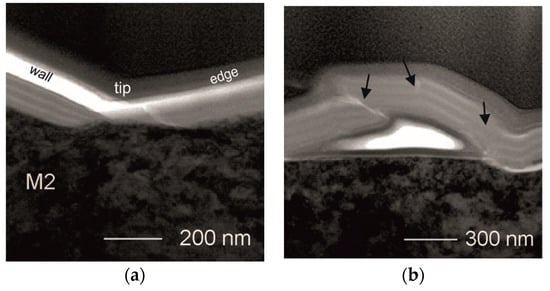To study the deformation mechanism of our multilayer in detail, thin foil was prepared for TEM observations. It was cut by FIB method, perpendicular to the from the indented area marked in Figure 4b as rectangle by dashed lines. TEM images (bright field BF) of the cross-sections of the strongly deformed coating are presented in Figure 5a—along the wall of the indentation and one of its edges, near the tip. There are no significant changes in the layered structure of the coating, being in contact with the wall of the indenter. The reduction in thicknesses of both TiBx and TiSiyCz is proportional. No loss of coating continuity within the layers is encountered as well. The coating stays continuous, although in the small area close to the tip of the indentation, the coating loses multilayered structure. Mixing of the material between layers occurs clearly. In the area placed near the tip, the presence of a nanocrack is noticed (Figure 5a). The coating-substrate boundary is continuous and flat. No mixing of the material between the coating and the substrate occurred. The density of dislocations is high in the subsurface area of the steel substrate, but no cracks are observed in it. Detailed observations outside the indentation area revealed a local detachment of the coating. It was observed near the boundary of between the indented and unindented areas (Figure 5b). This delamination was not noticed by SEM observations, probably due to its small height and lack of accompanying microcracks. The local detachment observed by TEM, was caused by pushing up the the coating material through the indenter. Regardless strong deformation, the coating remains continuous, but the order of layers is locally disturbed, (areas marked by dark arrows). This is accompanied by “self-healed” nanocracks. In the “self-healed” areas, the material of the layers is mixed. In general, nanocracks initiate in the TiBx layers. They propagate through the TiBx layer to subsequent TiSiyCz layer and end in it (Figure 5b). Similar cracking mode behavior has been reported in our earlier works that addressed the wear mechanism of the bilayer TiBx/TiSiyCz coatings deposited on 316L steel []. It is known, that in multilayered coatings the propagation of cracks through their entire thickness is hindered by the presence of interfaces between layers, especially when the interfaces are sharp and layers are materials of different shear modulus values []. In observed mechanism of self-healing in the (TiBx/TiSiyCz)x3 multilayer the microstructure and properties of TiSiyCz layer seem to play a key role. TiSiyCz layers are deposited using Ti3SiC2 target. That ternary carbide is recognized as damage tolerant material []. Both earlier and present experiments confirm the ability of amorphous TiSiyCz layers to dissipate excess energy of the cracking, caused by loaded, static stationary indenter (nanoindentation) as well as by a moving tip under linearly increased load (scratch-test). Similarly to work on Ti/TiB2 multilayer [], our experiments confirmed the validity of combining hard and brittle TiB2 with softer, damage tolerant materials in multilayer systems. However, unlike Ti/TiB2 coatings, no loss of continuity was observed in our coatings at the interlayer boundaries even at heavily overloaded systems.
