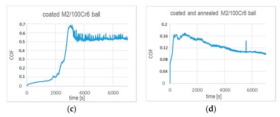 The annealing strongly affects the wear performance of the chosen tribo-couples and their coefficients of friction, as shown in Figure 7. In general, the CoFs of the coated substrates after annealing are significantly lowered. They are smaller than 0.2 during test times below 1000 s (Al2O3 ball) and 2000 s (100Cr6 steel ball), as indicated by Figure 7a,c. We note that these test times correspond to the respective coating lifetimes. At higher test times, i.e., when the coating wear proceeds, the CoF determined with the alumina ball stabilizes at 0.6 after a rapid increase. In the case of the CoF tested with 100Cr6 ball, a rapid increase is observed to ~0.7 and followed by a decrease to ~0.52. Figure 7b,d indicates that, over the entire range of the ball-on-disc test time, the CoFs do not exceed 0.26 in friction contact with alumina and 0.165 in the tests performed with 100Cr6 ball, respectively. It seems that annealing notably prolongs the durability of the coating in both friction contacts, as the values of CoFs remain at the level of values determined in the initial times of wear for the unheated coated samples.