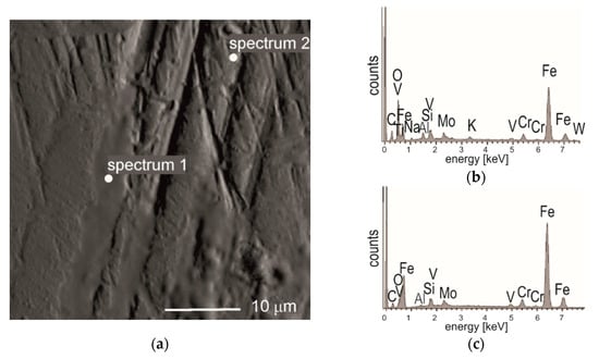 Detailed observation of the worn areas of balls and tested samples by the SEM method shows, that the main mechanisms of wear is of an abrasive-type. The microstructure of the worn area of the coated M2 steel after the ball-on-disc test with 100Cr6 steel (see Figure 8a) along with the EDS analysis of the marked area (Figure 8b,c), demonstrate the material transfer between the ball and the sample.