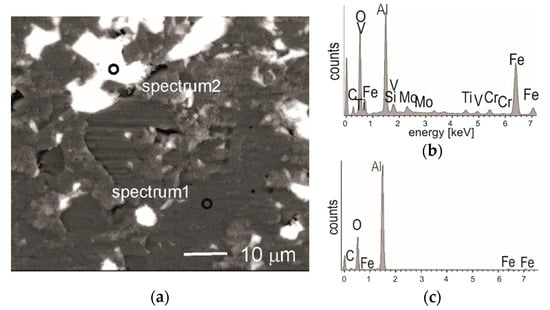 (a) Backscattered electron image of worn surface of the alumina ball with marked areas for EDS analysis; (b) EDS spectrum 1; (c) EDS spectrum 2.