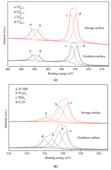 Figure 3a shows a Ti2p pattern of the oxidation surface of fresh and stored samples. The Ti2p spectra were decomposed into four chemical states, including Ti0 (Ti), Ti2+ (TiO), Ti3+ (Ti2O3), and Ti4+ (TiO2). It is implied that Ti4+ and Ti3+ stayed at the main valence state on the top TiO2−x surface. In addition, according to the area of each peak, the proportion of each Ti valence is actually different. The proportion of Ti3+2p3/2 on the surface of the sample stored in alkali solution was reduced by 6% compared to that of the fresh oxidized sample surface, whereas all the other proportions increased. The proportions of TiO2 and Ti2O3 were 52.01% and 47.99%, respectively, in the alkali solution, while the corresponding ratios of the fresh oxidation surface were 46.74% and 53.26%, respectively. Both of the oxidized surfaces included mainly Ti4+ and Ti+3 components. Figure 3b shows a O1s pattern of the oxidation surface of fresh and stored samples. Different from the oxidation surface, for the storage surface, only three O1s spectral peaks were obtained after the Gauss peak fitting treatment. Regarding the O1s peaks, the peaks corresponding to TiO2, Ti2O3, and the hydroxyl group (Ti–OH) had binding energies of 529.6, 530.3, and 531.7 eV, respectively. The oxygen on storage surface mainly existed in the form of TiO2 and Ti2O3 in proportions of 44.42% and 40.77%. In addition to the absence or few C–O groups, the level of Ti–OH dropped after alkaline storage, from 22.90% to 14.84%.