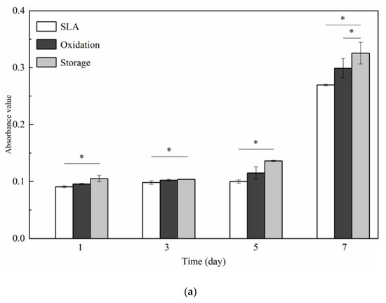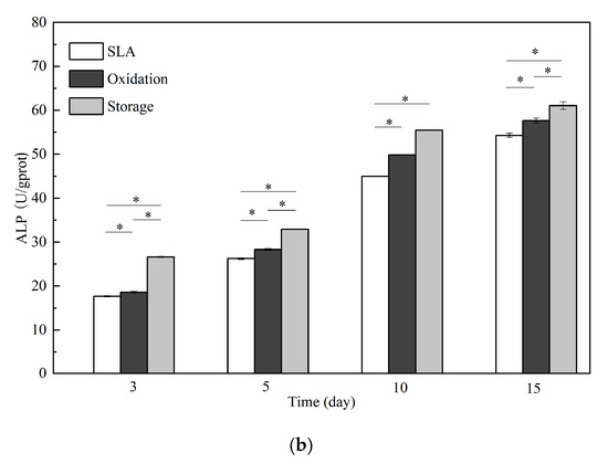 The MTT results of each group varied with time, as shown in Figure 6a. After 1, 3, 5, and 7 days of cell culture, the number of osteoblasts in the three groups gradually increased with time. The absorbance (OD) values measured for the three groups were storage > oxidation > SLA. Differences in the absorbance among the groups were observed at day 1, while differences observed on day 3 were not significant. However, the OD values at days 5 and 7 were remarkably larger than those at the other time points. Intracellular alkaline phosphatase (ALP) activity is one of the most widely employed metrics for mid-stage osteogenic differentiation. The results of the ALP assay are shown in Figure 6b. The results of the ALP assay are similar to the results of the MTT assay of cell adhesion and proliferation. The ALP activity values measured at the three test points revealed the following trend: storage > oxidation > SLA.