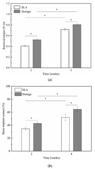 Considering the above results, in animal experiments, implants were divided into two groups: SLA samples and storage samples. The removal torque value (RTV) and bone-implant contact (BIC) results of the two groups are shown in Figure 7a,b. Comparing the size of the removal torque between SLA and storage, the results showed that the surface treatment methods of the two implants were statistically significant at different implantation times (P < 0.05); the difference between the groups was statistically significant (P < 0.05). The storage implants had a higher RTVs and BIC ratios than the SLA implants.