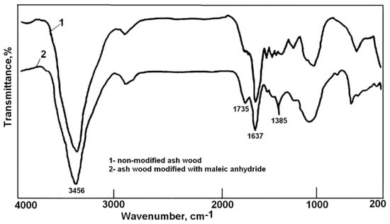 FTIR spectra recorded for wood sample from hardwood tree species (1—non-modified; 2—modified with maleic anhydride)—re-drawn from [49].