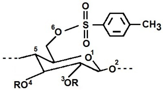 The structure of cellulose tosylate where the ester bond is at the O-6 atom.