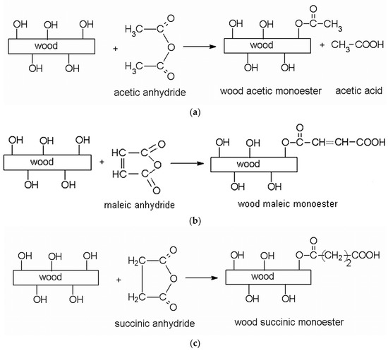 The reaction of wood subjected to anhydride treatment (e.g., acetic anhydride, maleic anhydride, succinic anhydride) can be exemplified as presented in Scheme 1. Through such chemical treatment, the molecular structure of wood polymer constituents is changed with positive effects on the wood properties, mainly the hydrophilic characteristics, thus the wood surface becomes more hydrophobic. Chemical modification of wood fibers is performed to provide a good compatibility by reaction with anhydrides that blocks the hydroxyl groups in the wood chemical structure, mainly for further inclusion in composite formulations with different polymer matrices. All these changes result in an improvement of biological resistance against various pests, and consequently have favorable impact as enhancing the dimensional stability and strength properties [85,86,87]. Cyclic anhydrides may react partially with wood when results a single ester function and a free carboxylic group.