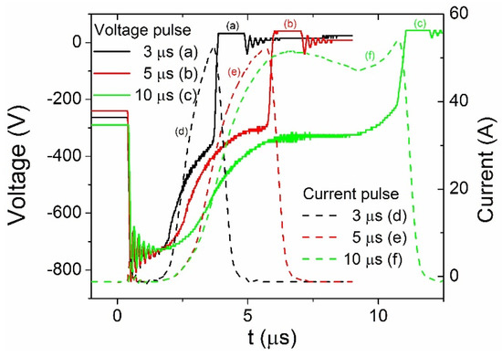 Arcing in reactive magnetron sputtering occurs as a consequence of breakthrough of an insulating layer formed on the sputtered target when the charge amount achieves a threshold value [19]. Therefore, the breakdown field appears as a result of charge accumulation, which is strongly related to the energy per pulse. Therefore, a solution to suppress or eliminate arcing is to limit the energy per pulse by limiting the power density and/or pulse duration. Hala et al. succeeded to suppress arcing by drastically limiting the energy per pulse using a peak power density value below 100 W/cm2 (significantly lower than conventional HiPIMS discharges) and by reducing the pulse duration up to 40 µs [13]. In this contribution, as the peak power density approached 1 kW/cm2, the strategy adopted to suppress arcing was to further limit the pulse duration by using ultra-short HiPIMS pulse duration (<10 µs). Selected current and voltage waveforms for the reactive HiPIMS discharge operated at various pulse durations (3, 5, and 10 µs) are plotted in Figure 1.