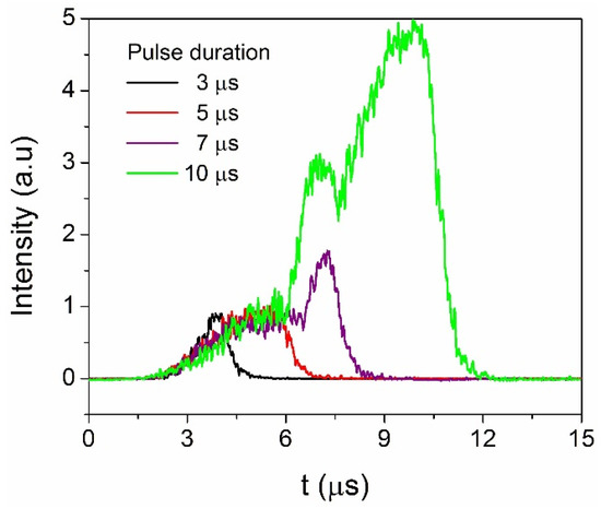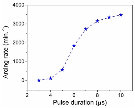 The sudden changes (humps) in Ar+ spectral line waveforms were related to the occurrence of arcing during the reactive sputtering process. Macro- and microarcs were counted using the recorded waveforms for a cumulative time of 1 min. Therefore, for each selected pulse duration, a total number of Ar+ (λ = 434.8 nm) spectral line waveforms equal to the product of 60 × f, where f is the pulsing repetition frequency, was recorded. Each recorded waveform was then analysed to identify the occurrence of arcs (the related humps) during the single pulse. Figure 2 shows the occurrence of microarcs (with a lifespan τ = 1 µs) during HiPIMS operation with 7-µs pulse duration and micro- and macroarcs (τ = 2.5 µs) during HiPIMS operation with 10-µs pulse duration. As compared to arc-free discharge, the peak intensity of Ar+ spectral line during microarcs and macroarcs was 50% and 500% higher, respectively. The arcing rate increased by increasing the pulse duration, this dependency being related to charge accumulation on the target surfaces. The decrease of the pulse duration for a constant average power led to higher pulsing frequency and, thus, to less target poisoning by reactive gas between the pulses, avoiding the arcing of the target. At the same time, shorter pulse duration implied less time for arc development which, in turn, led to a more pronounced arc suppression effect. By using ultra-short pulses, the propensity to arcing was significantly reduced because the arc onset was usually delayed relative to the application of the target voltage. These statements are supported by the study of the arcing rate as a function of the pulse duration, illustrated in Figure 3. It was found that arcing is significantly reduced if the pulse duration decreases below 5 µs.