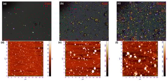 Optical micrographs (a–c) and AFM images (d–f) of SiO2 thin films deposited by reactive HiPIMS for three selected pulse durations (3, 5, and 10 µs).