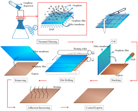 First, Kapton was cut into square of 15 mm, cleaned in acetone by a ultrasonic cleaner (KX-1620HG, 28KHz, Kexi, Beijing, China) for 10 min, and dried for use [47]. Second, different volume (1, 2, 3, 4 mL) of the 170 μg/mL graphene dispersion prepared previously was diluted by 60 mL deionized water, and then was filtered through a nylon membrane (φ50 mm, aperture size 450 nm, Shanghai Xinya, Shanghai, China) on a filter (2000 mL, Jiangsu Sanaisi, Jiangsu, China) by a vacuum pump (GM-0.33A, Tianjin Jinteng, Tianjin, China, pumping rate 20 L/min) [48]. Thus the graphene loadings on nylon membrane (mass of graphene per square centimetre) are 8.7, 17.3, 26.0, 34.6 μg/cm2. It’s worth noting that the graphene dispersion should be transferred into the filtering funnel very slowly to avoid air bubbles. Third, the wet nylon membrane with graphene was cut into square of 20 mm and immediately pasted onto Kapton with graphene against the Kapton surface with some pressure. Meanwhile, DMF was supplied to the edge of Kapton to extrude bubbles within the gaps between Kapton and graphene film. Subsequently, the adhesive layers was hot rolled by a roll laminator(FL271, Feiniao, Beijing, China, 30 min, 150 °C). After hot rolling, the adhesion force of nylon membrane decreased in a great extent and then were peeled off carefully [49]. Thus the graphene film was transferred onto the target substrate Kapton. Finally, the coated Kapton was heated at 140 °C in a vacuum drying oven for 10 h. This heat treatment can remove the DMF and reduce the gap between the graphene and the Kapton, resulting in increase of the adhesion [50,51]. So far we completed the Kapton coating of graphene. Figure 2 shows the coating process.