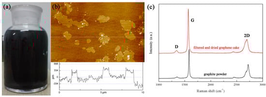 To understand the characters of the graphene prepared, AFM was utilized to gain the thickness and size information visually. Figure 4a is the photograph of graphene dispersion. Figure 4b shows the AFM image which can indicate that the number of graphene layers is less than 3. Figure 4c illustrates Raman spectra of a dried graphene cake and pristine graphite powder. While 2D band in Raman spectra can reflect information of graphene layers. It is observed that the 2D band of the graphene cake and the pristine graphite shows a marked difference, which indicates the success of graphene preparation [53]. In addition, the rise of D band illustrates that some defects were introduced into the graphene during the preparation process [54].