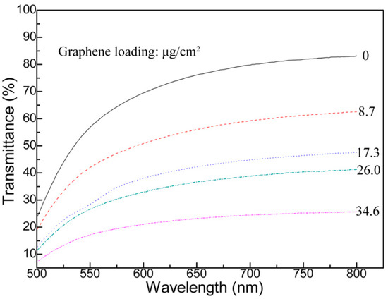 In addition, we investigated the transmissivity of coating samples with different graphene loadings (8.7, 17.3, 26.0, 34.6 μg/cm2) by ultraviolet spectrophotometer, as shown in Figure 6. It can be seen that the transparency is still preserved to some extent after coating and the transmissivity decrease with the graphene loadings increase. Consequently, balancing between transparency and AO erosion resistance should be determined by the requirements of practical applications.