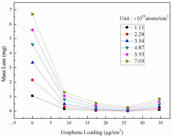 The graphene loadings on Kapton were 8.7, 17.3, 26.0, 34.6 μg/cm2. Higher graphene loading means thicker film [46]. It can be illustrated from Figure 7 and Figure 8 that the M-L and Ey of coated Kapton had dramatic drops compared with the naked Kapton, demonstrating the excellent protective effects of the graphene coatings. In addition, both the M-L and Ey first decrease and then increase with the increase of graphene loading. For the graphene loading of 26.0 μg/cm2, in the early exposure of 16 h (AO flux: 2.28 × 1020 atoms/cm2), there was negligible M-L and Ey. After 48 h exposure (AO flux: 7.09 × 1020 atoms/cm2), the M-L and the Ey of coated Kapton are only 3.73% and 3.67% of those of the naked Kapton, respectively. But if the graphene loading is further increase from 26.0 to 34.6 μg/cm2, the performance is degraded.