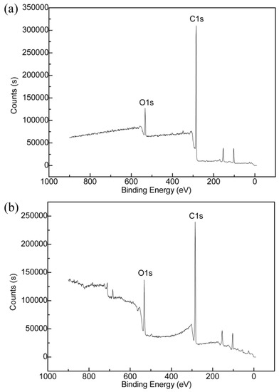Furthermore, the coated Kapton best-behaved in the AO exposure experiment (graphene loading 26.0 μg/cm2) was characterized by XPS, as shown in Figure 11. The element contents listed in Table 1 are calculated from XPS. It can be seen that the oxygen content increases obviously after AO erosion. We suggest that this increase is due to the combination of carbon and oxygen to from carbon-oxygen bond, leading to the oxygen retention on surface [36,37,62]. Before and after AO erosion, Nitrogen content of coating Kapton are both less than 1%, which demonstrates that vast majority of surface are covered by graphene flakes and no obvious new Kapton is exposed after AO erosion. Hence, it can also demonstrate that the graphene coating can protect Kapton perfectly.