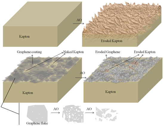 Figure 12 is the schematic of the mechanism that graphene coating protects Kapton from AO erosion. AO reaches the coating surface, and meets the top flakes. Some are blocked outside by graphene flakes [38], while some react with defects and edges of graphene flakes [63,64]. Moreover, with increase of AO flux, large amount of defects and edges are oxidized by AO, to bring about the holes and cracks growing in flakes and flakes fragmenting into small pieces [32]. As a result, after exposure, the surface of graphene became rough and fragmentized, illustrated in Figure 10.