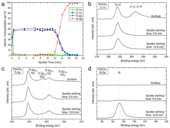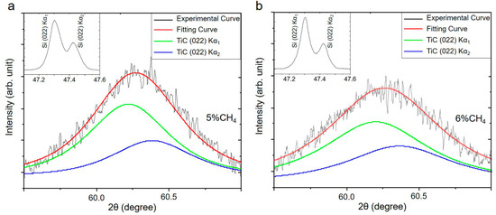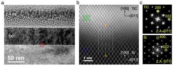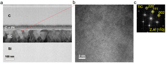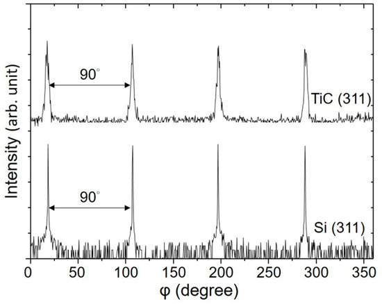 - Sheu, W.-H.; Wu, S.-T. Epitaxial Growth of TiC (002) on Si (001) by Reactive Magnetron Sputtering at Low Temperatures. Jpn. J. Appl. Phys. 1998, 37, 6094–6097. [Google Scholar] [CrossRef]