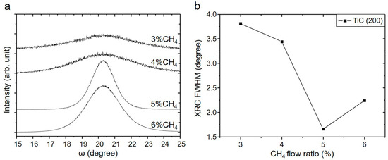 - Su, Y.; Wang, X.; Wang, H.; Wen, M.; Zheng, W. Grain-size effect on the preferred orientation of TiC/α-C:H thin films. Appl. Surf. Sci. 2012, 258, 6800–6806. [Google Scholar] [CrossRef]
