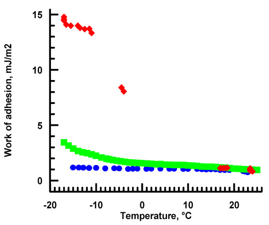 Temperature sensitivity of the work of adhesion of a liquid to solid surfaces results from the variation of the contact angle and the surface tension with the temperature. One of the major conditions for the icephobic behavior of a given surface is the preservation of the low value of work of adhesion even for the deeply supercooled state of aqueous liquids. Experimental data indicate that the environmental temperature decrease to low negative values is accompanied by some increase in work of adhesion (Figure 2) due to both the contact angle deterioration and the rise of liquid surface tension [9,13,23].