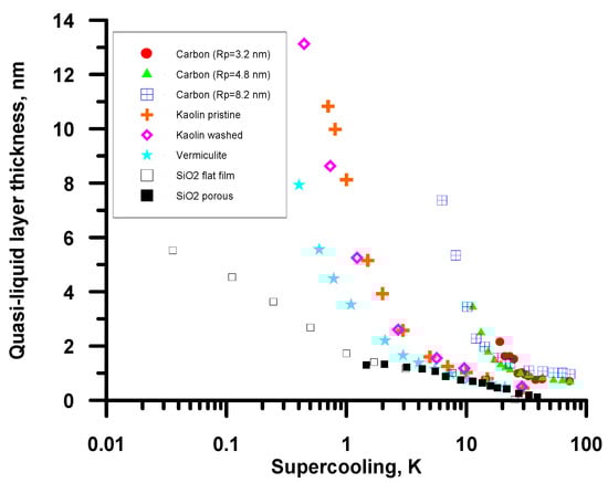 Thicknesses of a quasi-liquid layer on the ice surface in contact with different substrates as a function of supercooling with respect to bulk freezing temperature. Experimental data for porous carbon with different pore radii [58] and for kaolin (pristine and washed) and vermiculite clays [57] were estimated from high energy X-ray diffraction; for flat amorphous SiO2 film on Si block by the X-ray reflectivity measurements [59]; and for porous SiO2 particles imbibed with D2O by NMR studies [60].