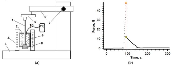 (a) Scheme of an experimental setup for measuring the shear adhesion strength of ice [103]. 1—test sample; 2—vessel with water/ice; 3—freezing device; 4—base; 5—force sensor; 6—movable lever;7—lever drive knob; 8—plug; 9—ice; 10—thermocouple; (b) Typical time dependence of force measured by the force sensor. Circles mark the maximum load force and the residual force after the failure of adhesion contact. Note that the non-zero residual force here results from the friction of an ice and the sample upon its movement in the iced bath after adhesion contact breaking.