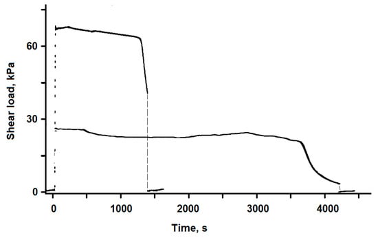 Dependence of shear stress measured by the loading force sensor on the time elapsed after the load is applied along the axis of an aluminum cylinder with a superhydrophobic surface, one of the ends of which is frozen in the ice at −8 °C. Two dependences corresponding to different values of the initial load are presented [4].