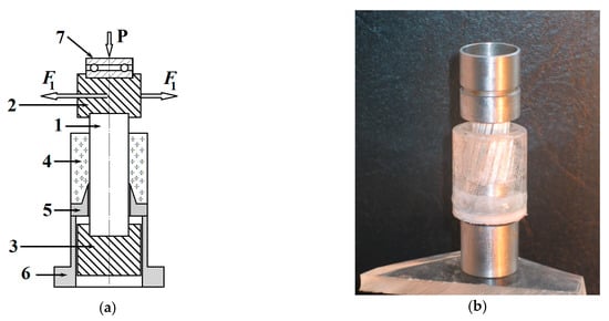 (a) Scheme of the device for testing ice adhesion to electric cables in conditions of combined shear [100]. 1—test sample; 2 and 3—clutches; 4—ice sleeve; 5—tapered bushing; 6—support bushing; 7—flat-thrust bearing; P—applied axial load; F1-F1—pair of forces applying a torsion torque; (b) Photo of the ice sleeve on the electric cable clamped between two clutches.