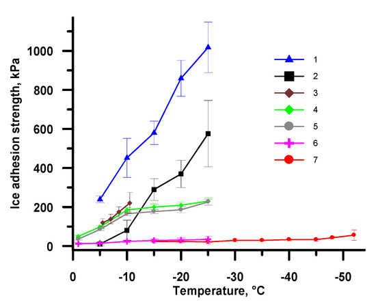 Temperature dependences of ice shear adhesion stress for different substrates: 1—ultra-smooth hydrophilic silica substrates (Ra < 0.4 nm) [60]; 2—silica plates coated with an adsorbed diblock copolymer layer [78]; 3—superhydrophobic aluminum rod [103]; 4, 5, 6—micro-nano structured aluminum surface modified by perfluorooctyltrichlorosilane, polydimethylsiloxane (PDMS), and silicon-oil-infused PDMS-modified surface, respectively [12]; 7—dimethylolpropionic acid—polyurethane composite coating with an aqueous lubricating layer [109].