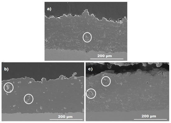 An increase in the applied load (5 N) allowed some distinguishing surface damage phenomena, as shown in Figure 4a. Among them, the as-sprayed HA coating displayed severe damage such as microcracks both in and beyond the residual groove, microfracturing/chipping at the groove boundary (Figure 4a). In the case of as-sprayed BNNP/HA coatings, it is evident from Figure 4b,c that the scratch width decreased, and the material chipping at the groove edges was inhabited significantly.