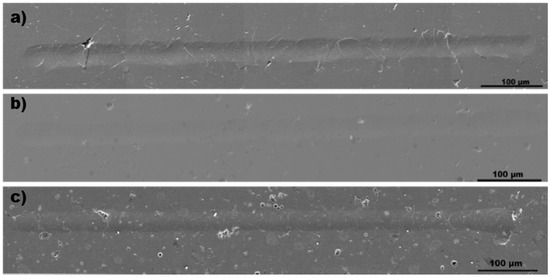 SEM images showing residual groove morphologies of (a) HA coating, (b) HA-1B coating, and (c) HA-2B coating at a normal load of 5.0 N.