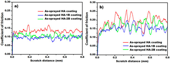 Coefficient of friction profiles of the as-sprayed coatings during scratch at a load of (a) 2 N and (b) 5 N.