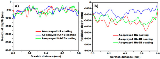 Residual scratch depths of the as-sprayed coatings during scratch at a load of (a) 2 N and (b) 5 N.