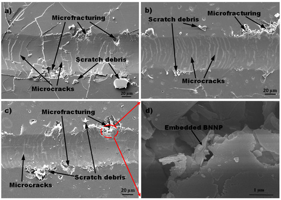 It is evident from Figure 3, Figure 4 and Figure 7 that local microfracturing or material chipping occurred preferentially at the scratch boundaries regardless of the addition of BNNPs. It is well recognized that the localized hydrostatic compressive stress should be produced within the scratch groove when the tested material gets in contact with the rigid sliding tip, and this localized hydrostatic compressive stress is high to impede cracking and brittle fracture to some extent [31]. However, the compressive pressure on the groove edges would decrease to near zero so as not to impede cracking and fracture, leading to preferential microcracking or microfracturing around the scratch edges. More interestingly, as compared to the HA coating, the increased density of microcracks within the residual grooves of BNNP/HA coatings was identified in Figure 4 and Figure 7. The authors think the following factors should be responsible for the following characteristics: (i) during scratching, tensile frictional stress exists in the coating surface behind the trailing edge of the spherical tip, leading to tensile cracking. (ii) coefficient of thermal expansion (CTE) of BNNP (−2.9 × 10−6/K along the α axis at ambient temperature) [32] is reported to be much lower than that of HA (11.5 × 10−6/K) [33], and; therefore, BNNPs would expand while the HA matrix would shrink during the cooling process after plasma spray, subsequently leading to hoop compressive stresses applied upon these BNNPs and tensile stresses on the HA grains. Therefore, the above tensile stresses on the coating surface during scratching resulted in increased microcrack density within the scratch grooves of the BNNP/HA coatings, which dissipated elastic strain energy that would otherwise cause fracturing of the scratched sample.