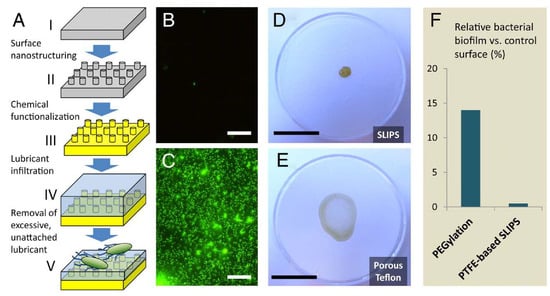 Visual summary of the slippery liquid-infused porous surfaces (SLIPS) approach. (A): SLIPS fabrication flow chart; (B,C): fluorescence micrographs of attached P. aeruginosa biofilm on SLIPS (B) and superhydrophobic Teflon (C) under the same conditions; (D,E): wetting characteristics of a drop-cast biofilm of P. aeruginosa on SLIPS (D; limited wetting, loosely attached and easily removable) and superhydrophobic Teflon (E; complete wetting, high adhesion); (F): comparison of biofilm attachment on a SLIPS surface (after 7 days) and on a PEGylated surface (after only 5 h), showing a 30-fold increase in anti-biofilm capacity for SLIPS against a gold-standard antifouling material. Reproduced from reference [34], with permission.