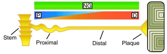 The byssus comprises four distinct regions which differ in terms of chemical composition, microstructure and morphology - and hence mechanical properties [20,38,39]: the stem, the proximal part of the byssal thread (corrugated and very highly extensible), the distal part of the byssal thread (straight and stiffer than the proximal, yet still significantly extensible) and the adhesive plaque (in contact with the substrate). The generation and release of the byssus takes place within and from a dedicated organ known as the mussel foot: a tongue-like element with an internal structure comprising amongst other features a longitudinal tubular channel (ventral groove). The foot itself has also a sensory role, as it probes the surface around the animal in order to select the exact place of attachment. When this happens, the foot attaches onto the specific area and a mixture of proteinaceous substances is secreted and shaped via contractions into the byssus with its four compartments. The process lasts just a few minutes and has been claimed to resemble several industrial polymer processing techniques [20,38,39,40,41]: extrusion [41] and injection moulding of collagenous liquid crystals [39] for the byssal thread, sizing for the deposition of a protective coating on both thread and plaque [41], and reactive injection moulding for the formation of the adhesive plaque [20,38,39,40,41]. The microenvironment within this “multi-processing chamber”, and specifically for plaque formation, is very carefully controlled in terms of pH, ionic strength and redox conditions in order to achieve optimal results with respect to adhesion of the plaque and mechanical performance of the byssal thread [39].