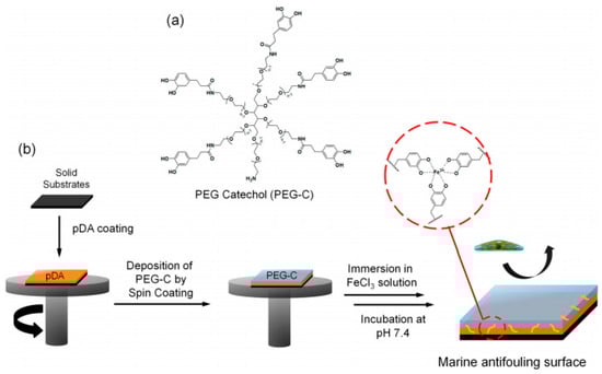 - Kim, S.; Gim, T.; Jeong, Y.; Ryu, J.H.; Kang, S.M. Facile Construction of Robust Multilayered PEG Films on Polydopamine-Coated Solid Substrates for Marine Antifouling Applications. ACS Appl. Mater. Interfaces 2018, 10, 7626–7631. [Google Scholar] [CrossRef] [PubMed]