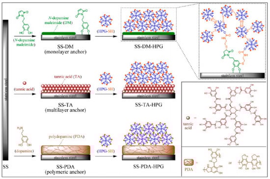 - Khalila, F.; Franzmann, E.; Julian Ramcke, J.; Dakischew, O.; Lips, K.S.; Reinhardt, A.; Heisig, P.; Maison, W. Biomimetic PEG-catecholates for stabile antifouling coatings on metal surfaces: Applications on TiO2 and stainless steel. Colloids Surf. B Biointerfaces 2014, 117, 185–192. [Google Scholar] [CrossRef] [PubMed]