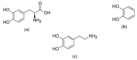 Structures of (a) l-DOPA (l-3,4-dihydroxyphenylalanine); (b) catechol (1,2-bisphenol); and (c) dopamine (produced from the decarboxylation of l-DOPA).