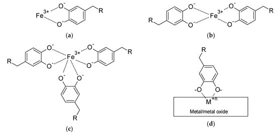 Complex formation of catecholate ligands with a variety of metal ions (e.g., Fe3+, V3+, Mn3+, Ti4+, Cu2+, Co2+, Ni2+) in solution has been documented using small molecules (catechol itself, and tiron: 4,5-dihydroxy-1,3-benzenedisulfonic acid disodium salt) [58], short l-DOPA-containing oligopeptides (e.g., alanine-l-DOPA-threonine-proline) as MFP mimics prepared by standard solid-phase peptide synthesis [59], and uncured mussel foot protein extract removed from Mytilus edulis [60]. The two former studies focused on ultraviolet–visible (UV-Vis) absorption of aqueous solutions and relevant complex formation/binding constants, and revealed that the complex stoichiometry (mono-, bis- and tris-catecholates) and the spectroscopic and binding properties of the formed complexes were in general similar between catechol itself and the oligopeptide MFP mimics [59]. The latter study [60] focused on the mechanical properties of the formed crosslinked network after mixing the MFP extract with various amounts of metal ions. The mechanical strength of the Fe3+–catechol gels was at least five times higher compared to all other metal ions tested, indicating the particularly high affinity of Fe3+ for the catecholic hydroxyl ligands. These observations tie in with the previously mentioned works on the cuticle of the mussel byssus [52,53,54,55,56] where bis- and tris- Fe3+–catecholate complexes were identified by Raman spectroscopy as the crosslinking mechanism. Wilker et al. [60] also make the point of the very high trace metal content (e.g., Mn, Fe, Cu, Zn) found in mussels compared to average concentrations in open ocean. Scheme 2a–c shows the structure of mono-, bis- and tri- Fe3+ catecholates.