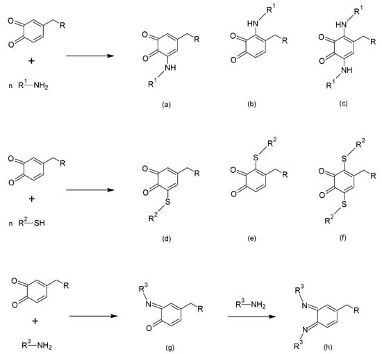 Generic reaction schemes of o-quinone species with nucleophiles. Top and middle: Michael-type addition with amines (top) and thiols (middle), with 5-substituted dominant products (a,d, respectively) depicted together with minority products substituted at the 2-position (b,e) and the 2,5-bis-variant (c,f). Bottom: Schiff base (imine) formation by reaction with amines, with mono- (g) and bis-imine (h) products.