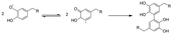 Generic reaction scheme for aryl coupling of semi-o-quinone species (see Scheme 3b) and formation of a 5,5′-biaryl adduct (termed as 5,5′-diDOPA in [38,51]).