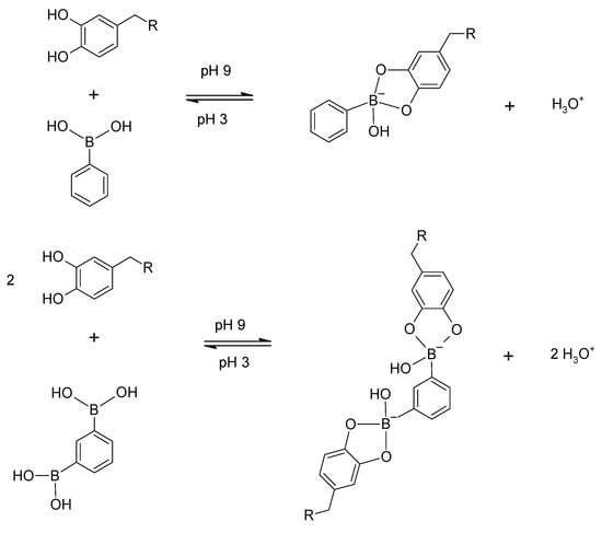 A last covalent reaction of the catechol hydroxyls which has been neatly exploited in mussel-inspired pH-responsive hydrogels [66] and smart hydrogel adhesives [67] is the reaction with phenylboronic acids and the reversible formation of borate esters (Scheme 6).