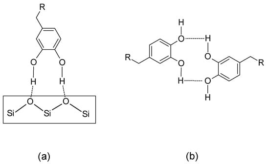 Apart from coordination to a metal ion centre and formation of different complexes as described in Scheme 2, the catechol moiety is one of the most versatile in terms of engaging in non-covalent interactions [19,20,57,70]—namely hydrogen bonding, π–π stacking, and cation–π interactions. The MFPs and their synthetic analogues can furthermore take part in longer-range electrostatic attractions between oppositely charged ions (between cationic aminoacid residues in MFPs and negatively charged surfaces, e.g., lysine and mica, respectively [71]), as well as in hydrophobic interactions between the catechol rings and non-polar residues on surfaces [72]. The versatility of the numerous possible non-covalent interactions stemming from l-DOPA and catechol presence has been identified as a unique contributor in the universal (including underwater) adhesive ability of MFPs and their synthetic counterparts [70,73]. For instance, while Scheme 2d depicts the adhesion mechanism of catechol on metal and metal oxide surfaces, different mechanisms have been identified for the adhesion of extracted MFPs (MFP-1, MFP-3 and MFP-5) on polystyrene and poly(methyl methacrylate), PMMA [73]. Specifically, hydrophobic interactions between the methoxy moiety in the methacrylate group and non-polar segments in the MFPs (e.g., glycine) were proposed to be the reason for the good adhesion of MFPs on PMMA. Similarly, a combination of hydrophobic, π–π stacking and cation–π interactions seems to be the driving force behind strong MFP adhesion on polystyrene. All these specific MFPs have several cationic aminoacids in their sequence that provide cation centres and can bind to the styrene rings, as well as aromatic (for π–π stacking) and hydrophobic side chains from the appropriate aminoacids. In the case of aluminosilicate glass substrates [72,73], it is bidentate hydrogen bonding (Scheme 7) between the catechol hydroxyls (donors) and oxygen atoms in the aluminosilicate network (acceptors) that constitutes the dominant adhesion mechanism, with coordination to the Al3+ centres (if present) also playing a role. As most glasses have surface OH groups as well, these could also contribute in a similar manner (as donor or acceptor).