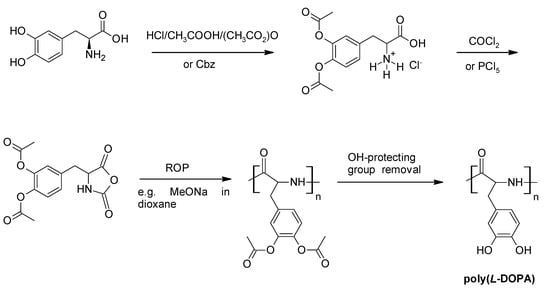 The first efforts to produce synthetic analogues of MFPs were bound to focus on mirroring the early identified mussel protein structures and aminoacid sequences, with Yamamoto [77] producing a synthetic version of the MFP-1 repeating decapeptide identified by Waite [42], using aminoacid end-group coupling reactions. The produced decapeptide was tested in terms of adhesive properties on iron and alumina substrates with promising results. Interestingly however, the notion of a DOPA-bearing polymer has been researched as early as 1957 [78], with a racemic poly(dl-DOPA) synthesized from its acetylated N-carboxyanhydride (NCA) by phosgenation and subsequent ring-opening polymerisation (ROP) and deacetylation, to regenerate the bisphenol functionalities. The optically pure l-DOPA and its synthetic poly(α-aminoacid) was first mentioned by Yamamoto et al. [79,80] where the carobxybenzyl (Cbz) protected (both hydroxyl and amine groups) l-DOPA was converted to its NCA using PCl5 and subsequently ring-opened-polymerised [79] and converted to poly(l-DOPA) by removing the carboxybenzyl groups [80]. High molecular weight poly(l-DOPA) was reported [81] by a similar route, where the carboxybenzyl group was replaced by acetylation, and ring closure to yield the NCA was conducted by COCl2 (similar to [78]). Scheme 8 depicts the generic synthetic pathway to poly(l-DOPA) via ROP of an OH-protected NCA, with elements from both reported approaches [79,80,81].