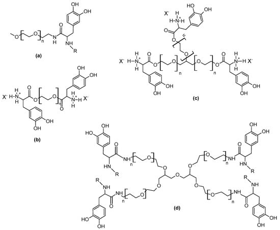 Mussel-inspired PEG structures: (a) monofunctional [90], (b) bifunctional [75], (c) trifunctional [75], (d) tetrafunctional [90]. X−: TosO−, R: H- or Boc. Structures a, d re-drawn from [90], with permission. Copyright (2002) American Chemical Society. Structures b, c re-drawn from [75], with permission. Copyright (2019) John Wiley and Sons.