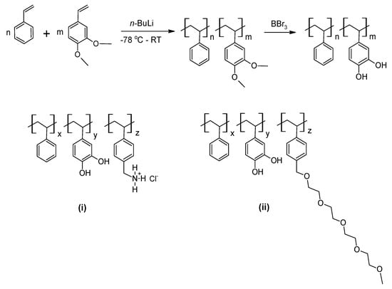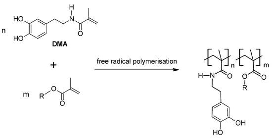 While mussel-inspired PEG derivatives and related structures focused mainly on end-group coupling chemistries and coating/hydrogel applications in the biomedical field, the quest for simple, high molecular weight synthetic analogues of MFPs which would resemble their adhesive properties continued—with both chain-growth [102,103,104,105,106,107,108,109,110,111,112] and step-growth [95,113,114,115] high polymers with catechol-bearing pendant chains being reported. The strategies followed were: (i) polymerisation of catechol-bearing monomers (with protected hydroxyl groups, or not, depending on the polymerisation conditions); (ii) post-synthesis modification of high molecular weight polymers with suitable catechol-functionalised agents. The latter approach extended also to various biopolymers [116]. Most of the above efforts focused on the incorporation of the catechol moiety as the key feature, while some also attempted to introduce some of the other characteristics identified in the MFPs (e.g., the presence of cationic residues).